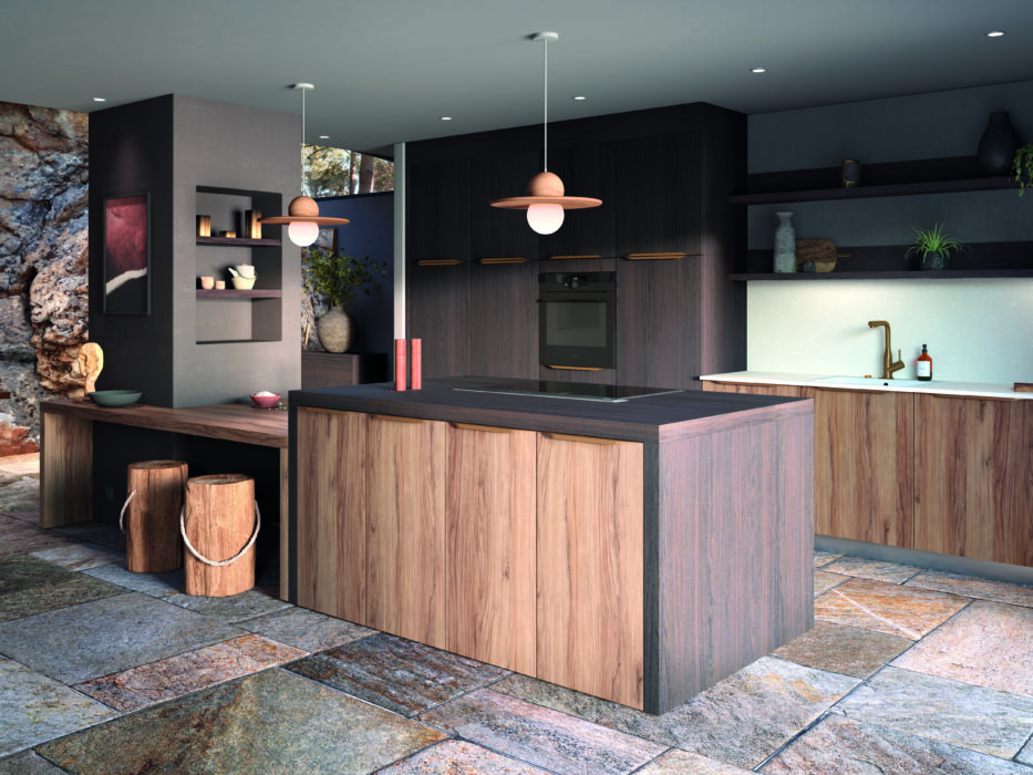 Noyer Orlando foncé et noyer Regia clair au menu de cette cuisine authentique, accompagnée par une vaste table accueillante « D’assi » Be Natural en prolongement de l’îlot. Un agencement sobre au caractère affirmé. « Origines », Arthur Bonnet.