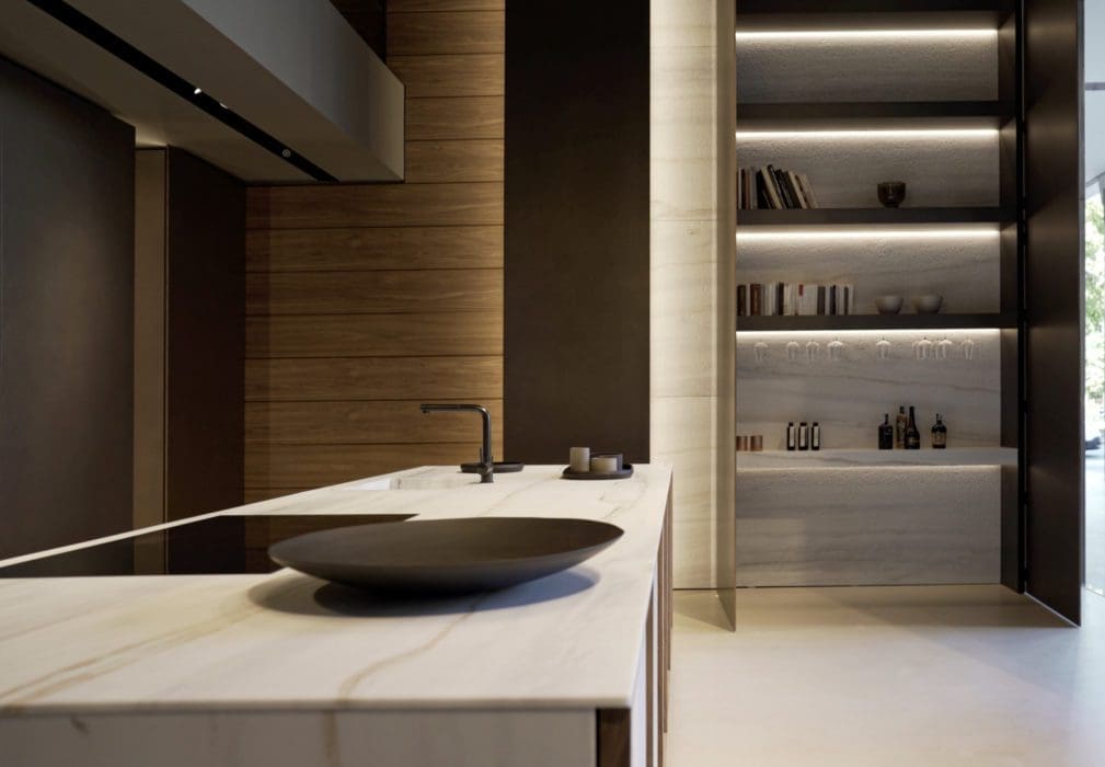L’immense îlot fait office de transition entre le salon et la cuisine. Pour atténuer la présence de celle-ci, un pan de mur est revêtu de vitrines éclairées qui offrent rangement et espace d’exposition. « Pure », SieMatic.