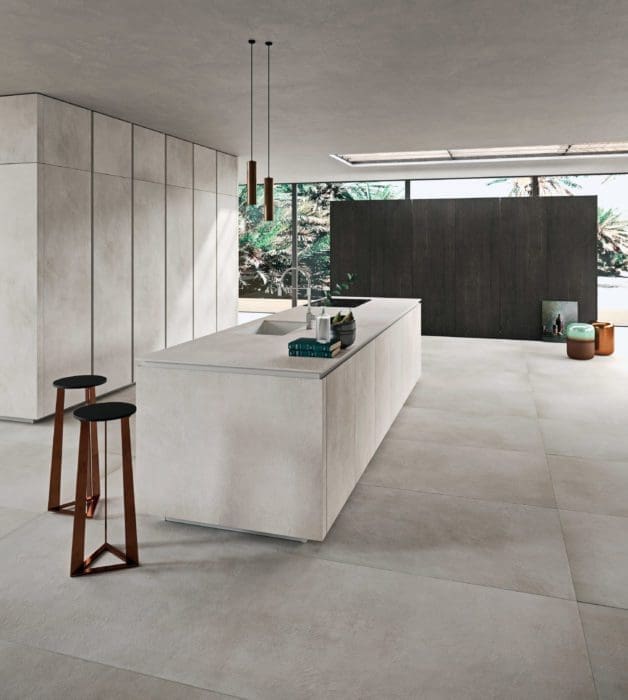 Pour cette cuisine « Way Materia » de Snaidero, le plan de travail a été travaillé dans une unité de ton avec les façades des colonnes. Une intégration parfaite qui fait oublier l’aspect technique de l’agencement. « Calce Bianco », Laminam.