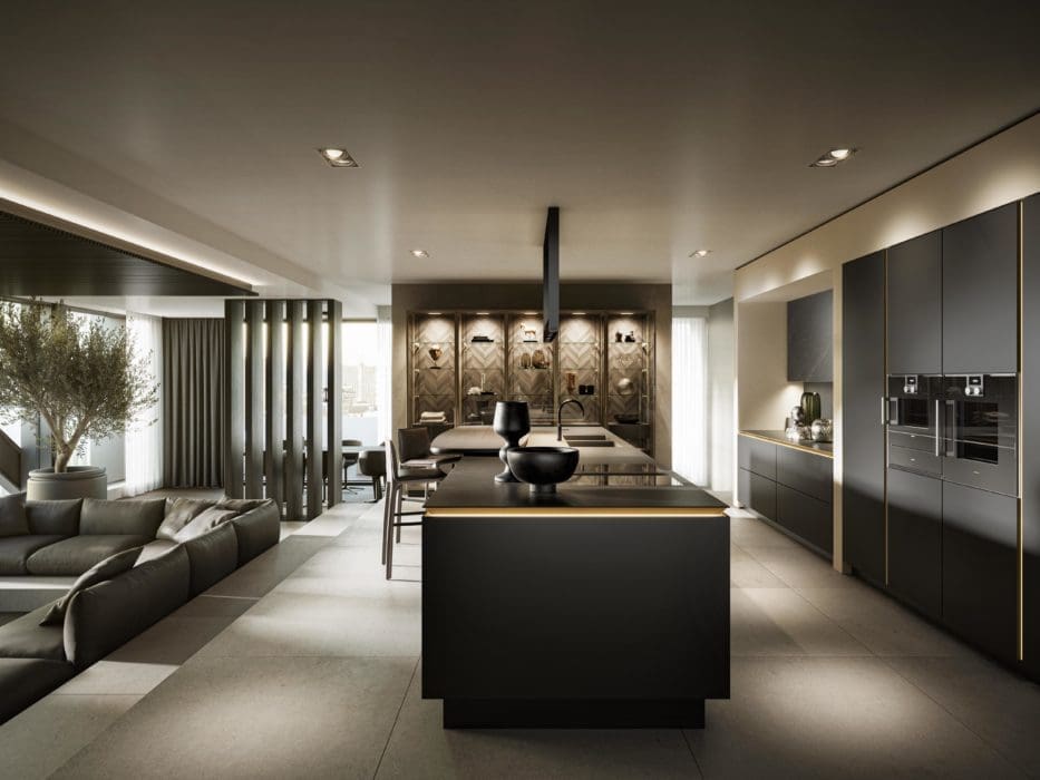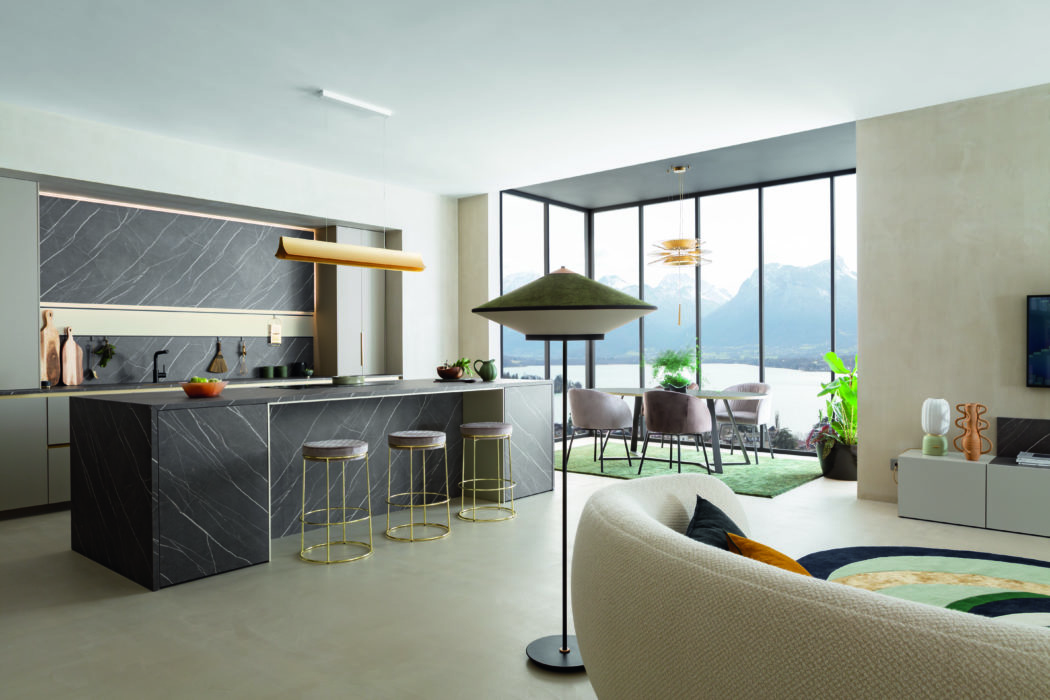 Cet espace salon et cuisine joue la carte de la coordination, pour une impression de sérénité. Les effets marbre noir associés aux façades Fenix® beige Arizona garantissent une unité de ton que les touches de laiton viennent réveiller. Perene.