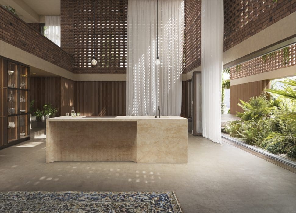 L’architecte d’intérieur américaine Nina Magon signe cette collection de six coloris marbrés qui s’ajoutent à la palette Dekton®, comme ce modèle « Awake » qui s’invite avec élégance sur l’îlot de cette cuisine ouverte. « Onirika », Cosentino.