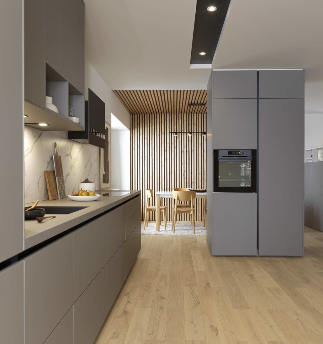 L’élégante teinte sourde « Nano Claystone » des façades sans poignées de cette cuisine habille aussi le salon et la salle à manger attenants. L’unité est parfaite dans cet espace ouvert, rythmé par les colonnes en pose libre.« Eolis », Schmidt.
