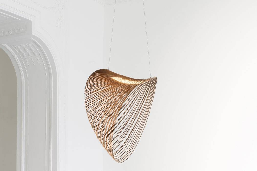 Découpées au laser, ses fines lames de bois stratifié vibrent avec subtilité au rythme des mouvements de l’air pour créer un jeu de lumière tout en nuances.