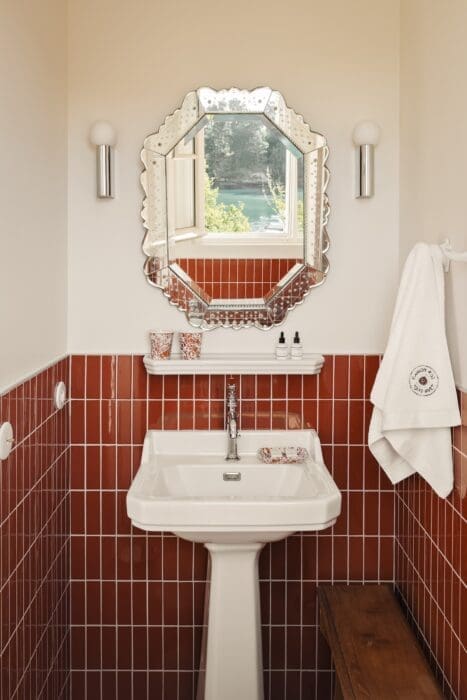 Chaque détail compte, y compris dans cette salle de bains, où un miroir vintage rencontre des appliques contemporaines. © Adrien Ozouf