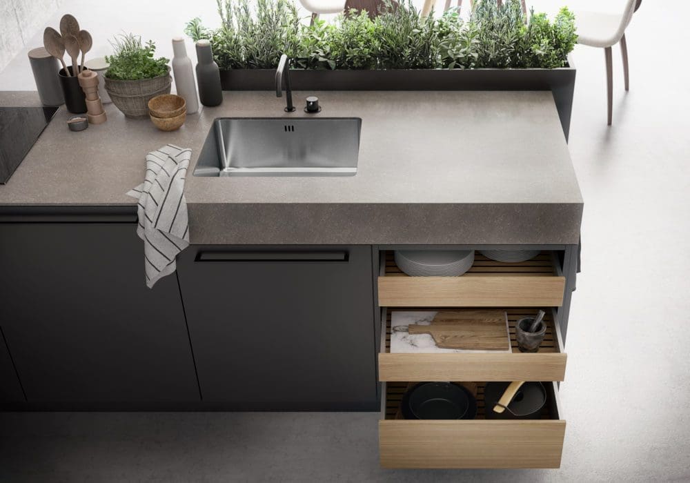 « Dans ce havre de paix qu’est l’habitat, on note actuellement une vraie envie de se reconnecter à la nature, qui se traduit par la présence de végétal, des thématiques minérales, du bois et des teintes terriennes. » Richard Perrin, chef de gamme Mobalpa.