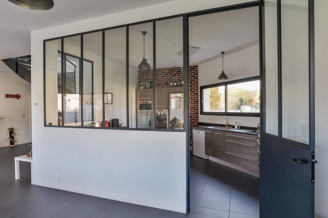 La cuisine se laisse découvrir grâce à cette large verrière réalisée par un ferronnier d’art