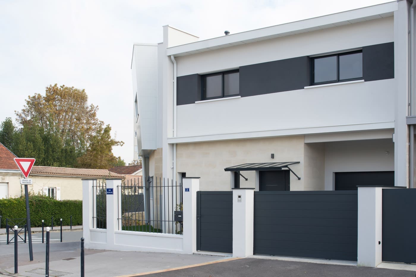 De multiples rendez-vous auront été nécessaires pour affiner le projet, et trouver le juste équilibre. Pour Trabeco, il convenait de respecter le souhait des architectes de la ville de Bordeaux de voir une réalisation originale quant à son esthétique. Le projet devait également proposer une cohérence d’ensemble entre les deux maisons, qui sont mitoyennes. Il s’agissait aussi de ne pas dénoter par rapport aux constructions du quartier. L’architecte de Trabeco Bordeaux s’est donc attaché à offrir un projet qui joue à la fois sur les codes traditionnels des maisons bordelaises, avec l’usage de la pierre de Frontenac en parement extérieur, et sur des éléments plus contemporains. En plus de leur modernité, ils apportent une signature à la construction et affirment un style. C’est le cas par exemple des menuiseries (portes d’entrée, fenêtres, portes-fenêtres, volets…), grilles et portails pour les deux maisons, dont la tonalité gris anthracite tranche avec l’enduit clair. Pour les accompagner, de grands brise-soleil dans le même esprit ont été installés, en rez-de-chaussée et à l’étage. Mais le détail architectural le plus étonnant est le mur métallique incliné, implanté en façade côté rond-point. Très visible de la rue car situé au premier étage, il signe véritablement l’architecture du lieu. Sa réalisation a demandé de sérieuses études de la part de Trabeco pour l’accrocher à la façade maçonnée. Mais aussi pour qu’il reste esthétique et apparaisse comme un élément à part entière de la maison, et non comme une structure rapportée.