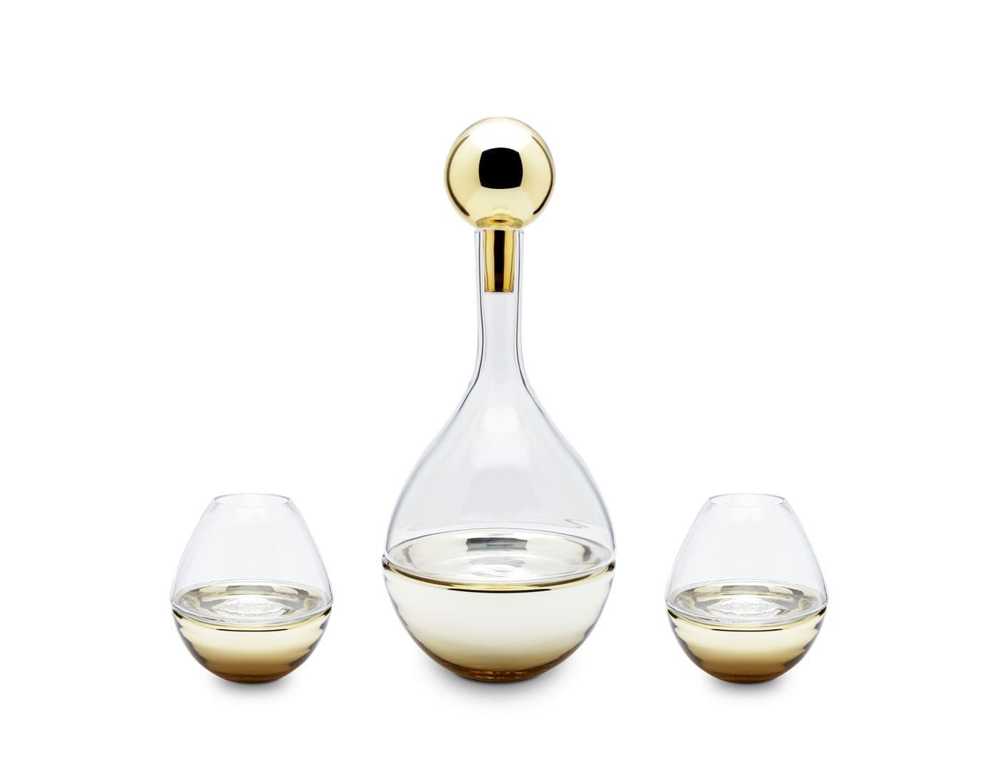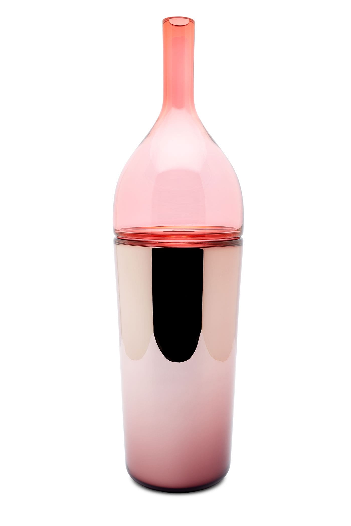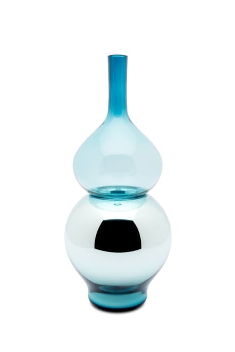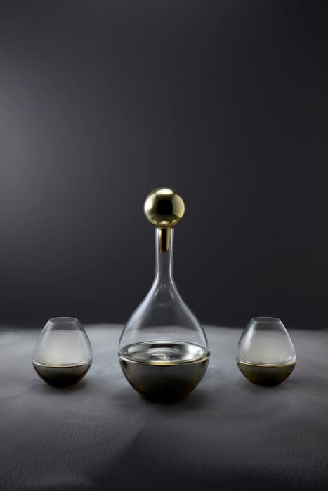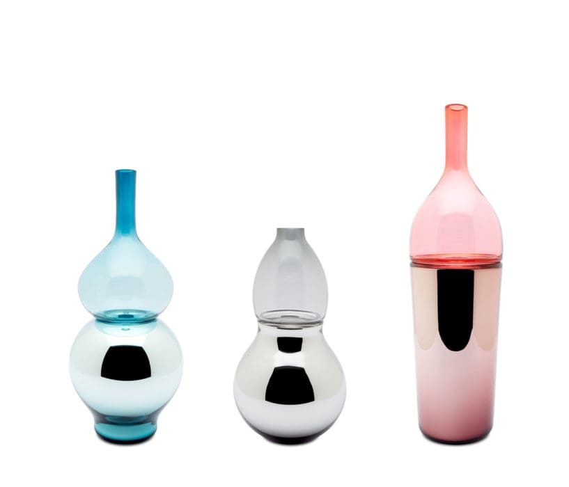 Evoquant les formes généreuses et courbes subtiles des alambics d’alchimie, la nouvelle gamme dessinée par Sacha Walckhoff pour Verreum est composée de vases, carafes et timbales, formées chacune de deux éléments séparables, en verre soufflé bouche d’une part et en verre métallisé de l’autre. A la fois ludique et fonctionnelle, chaque pièce se métamorphose, comme en chimie…