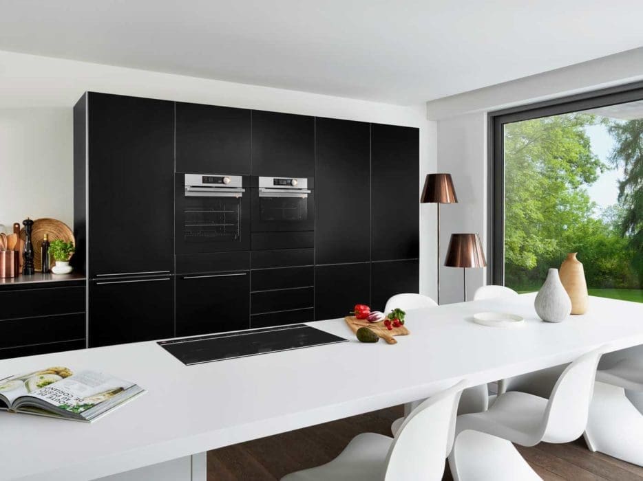 Contraste. Dans cette cuisine d’exception, les façades sont rythmées par les veines naturelles du noyer et les lignes verticales continues. En opposition, l’îlot s’habille d’un effet pierre reproduit à la perfection sur céramique. Bossa, Leicht.