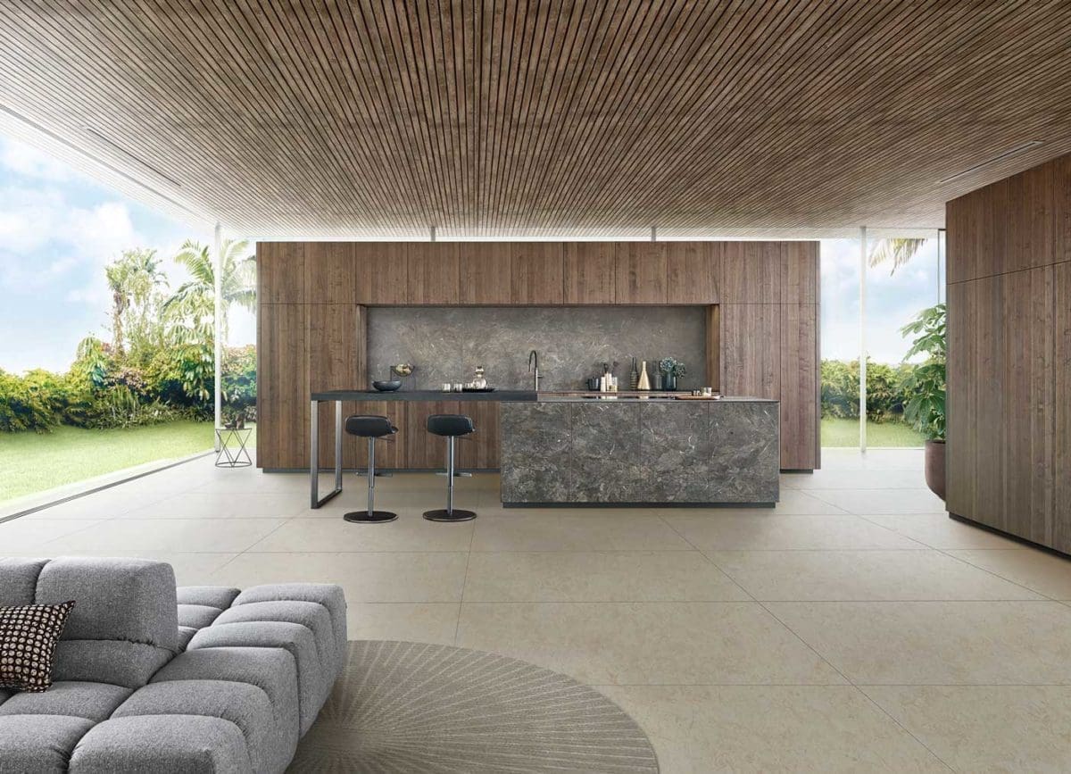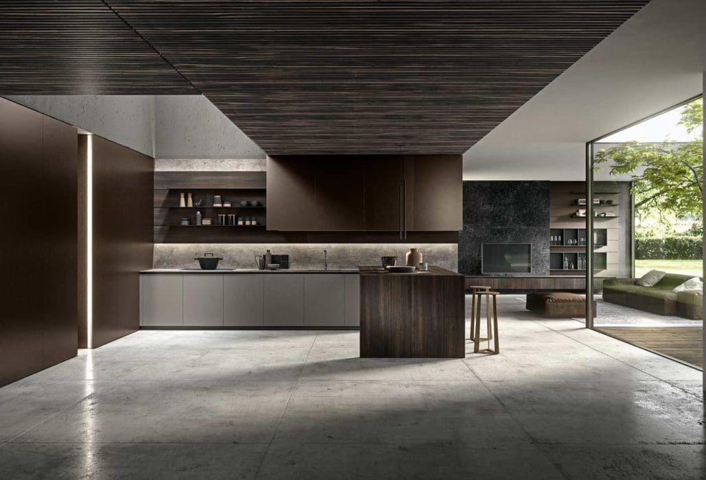 Italienne. Cette cuisine valorise les matériaux avec son îlot réalisé en Milltech Eucalyptus. Les plans de travail sont en grès et les façades laquées. Les meubles hauts et colonnes affichent une finition Leaf metal dark brown. Twenty, Modulnova.