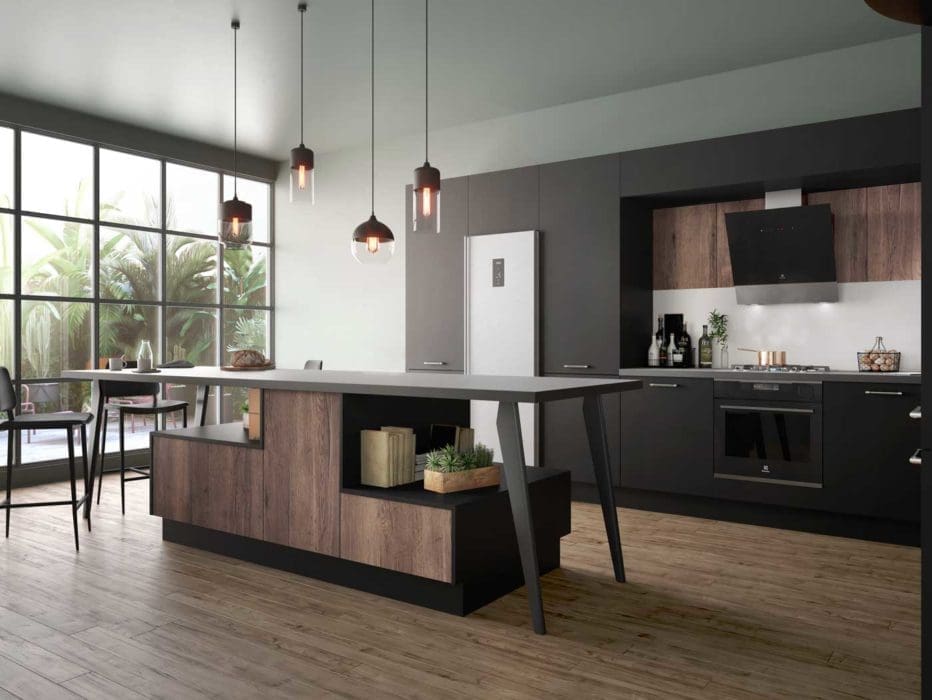 Leçon de style. Impressionnant par son look affirmé, cet îlot donne le ton. Il associe des rangements de hauteurs différentes, surplombés d’un plan posé sur un piètement léger, habillé de bois et de Fenix NTM noir. Chic Urbain, Arthur Bonnet.