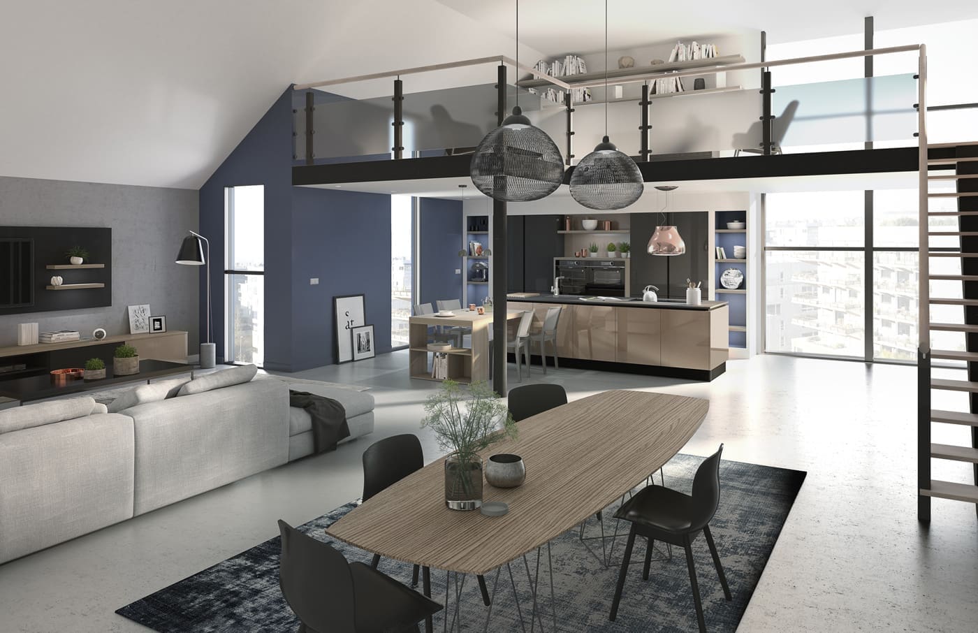 Côté couleurs, on joue sur la sobriété et le minimalisme. La cuisine marie harmonieusement le noisette des façades avec le noir brillant des armoires. Cet accord vient dynamiser le bleu intense des niches qui apporte une touche masculine à la composition. Côté textures et matières, Équinoxe joue entre minéral et végétal, brillant et mat pour créer un univers doux plein de relief. L’espace repas est en frêne albâtre tandis que le plan de travail est en céramique aux teintes grises. Un mariage féminin/masculin très réussi !