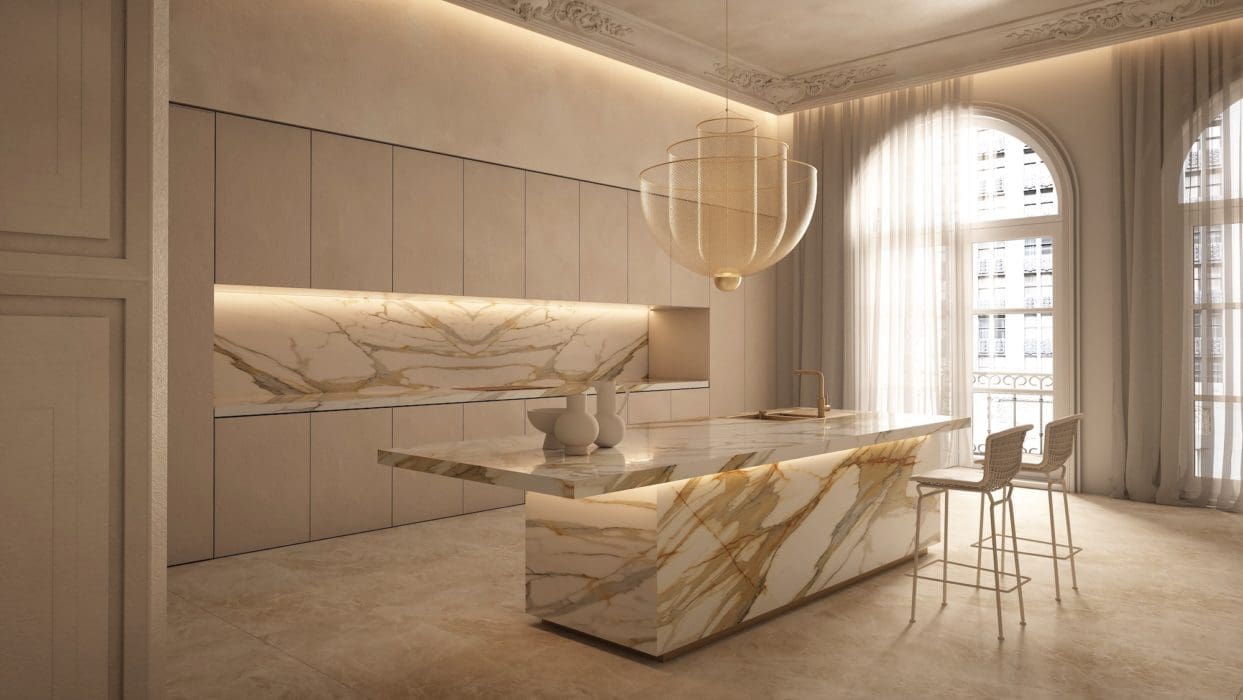 Surfant sur les tendances hexagonales actuelles, Laminam a en effet imaginé deux coloris veinés au caractère marqué pour faire le show dans cette pièce devenue cœur battant de la maison. « Nero marquina extra bocciardato » convoque ainsi un Black&White subtilement graphique et luxueux, tout en jeu de texture, qui habille la cuisine de son stand. Et, pour un effet pictural résolument dans l’air du temps, « Calcatta mediceo lucidato » (ci-dessous) marbre un blanc immaculé d’un veinage doré assumé.