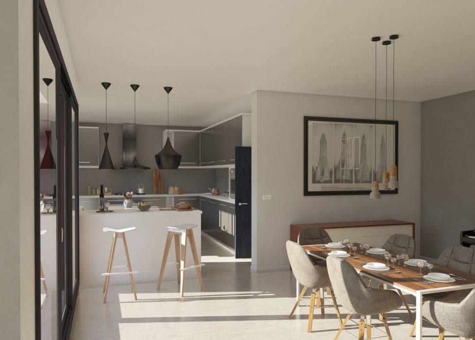 Le projet est à la hauteur des demandes. Il propose une maison certes aux accents architecturaux, mais dont les lignes et le style respectent l’environnement. Les matériaux choisis pour les façades associent du bois en bardage, et des plaques de cuivre traité pour ne pas se corroder, ce qui apporte une noblesse et une touche d’originalité. Le tout dans des tonalités très naturelles. « L’intention était d’offrir un maximum d’ouverture et de lumière naturelle dans cette maison, indique le constructeur. C’est pourquoi j’ai proposé à mes clients un Lumicène, un espace fenêtre circulaire. » Ce volume original, entre véranda, terrasse et bow-window, offre un aménagement à mi-chemin entre l’intérieur et l’extérieur. Circulaire, ce concept de menuiserie bioclimatique est composé de vantaux cintrés, coulissant le long d’un rail circulaire. Cela permet de protéger la maison des frimas, dans une version jardin d’hiver, et d’ouvrir totalement l’espace en été en se transformant en terrasse. Il apporte également une belle plus-value à la maison. La construction joue avec les volumes et l’espace. Elle offre une hauteur sous plafond de 3,5 mètres en moyenne, qui atteint 4 mètres dans le vaste séjour de 93 m2, avec des ouvertures en hauteur pour apporter encore plus de lumière. Une cuisine ouverte de 20 m2 jouxte cette pièce. La maison est construite dans le respect de la réglementation thermique actuelle, et anticipe même celle à venir. Elle intègre les équipements de domotique : volets roulants couplés à une sonde de luminosité, gestion du chauffage à distance…