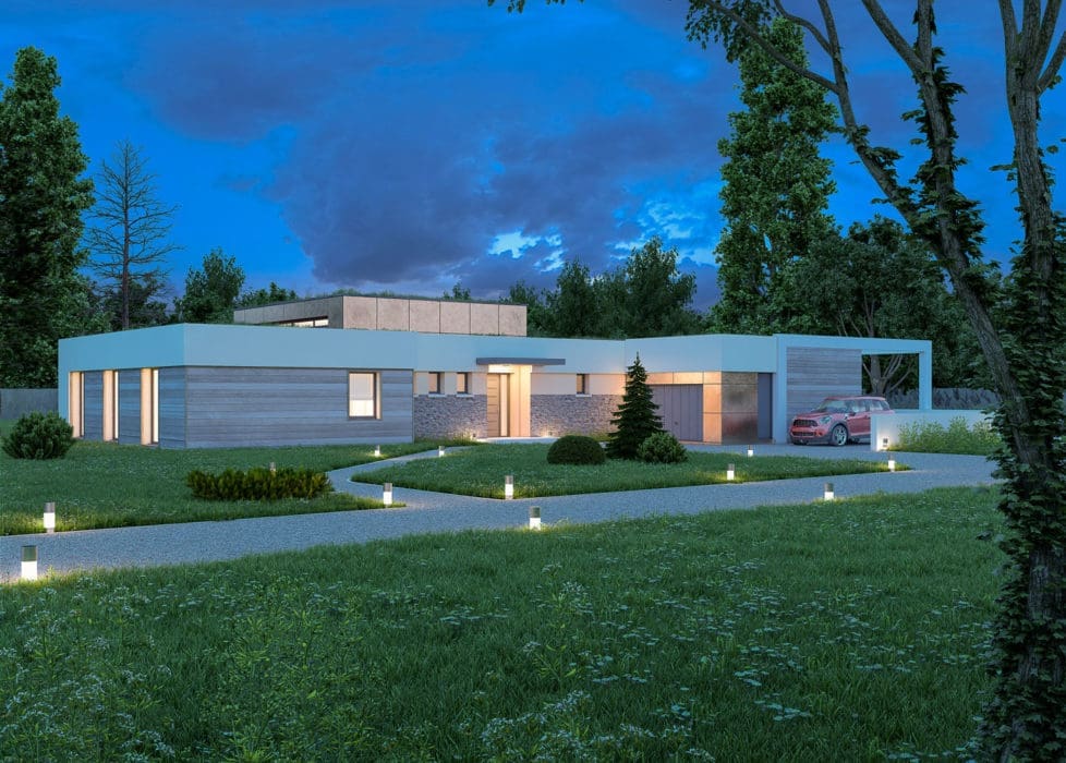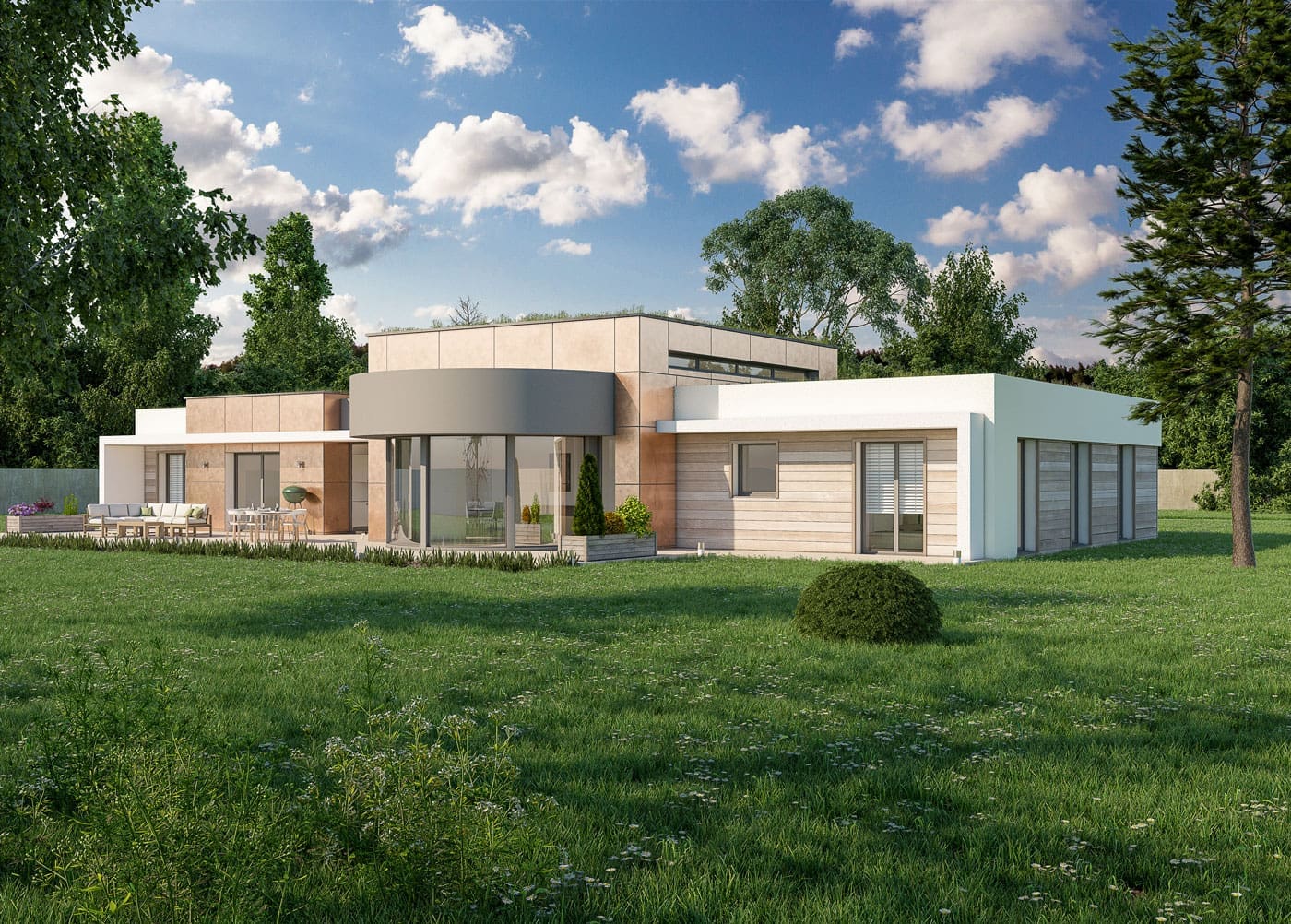 C’est en Ile-de-France, dans le Gâtinais, que Jean-Michel Bournerias, le responsable du constructeur Terre & Demeure, concessionnaire Trabeco pour la région parisienne, mène ce projet. Il s’agit pour lui et son équipe de réaliser la construction d’une maison exceptionnelle à plus d’un titre. Sur un terrain de 2 800 m2, il implante en effet une demeure de plus de 330 m2 de plain-pied, avec un sous-sol. « Les clients de ce projet sont un couple d’une soixantaine d’années, qui, en vue de leur retraite, ont choisi de faire construire une grande maison d’architecte contemporaine. S’ils y vivront seuls, ils ont trois enfants et des petits-enfants, et veulent une demeure confortable et spacieuse pour les accueillir. Nous avons donc imaginé une maison agréable, proposant trois chambres pour la famille dont une suite parentale avec dressing et salle d’eau, et de vastes espaces de vie au quotidien. »