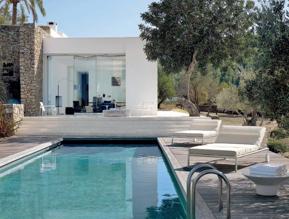 Une blancheur ambiante ponctuée par les lourdes portes en ébène de Macassar qui occupent la hauteur sous plafond, par la porte originelle du four à pain, les amphores à huile, par quelques meubles en iroko et objets rustiques en bois de l’époque agricole de la finca. Ce charme minimaliste à l’austérité néanmoins très confortable tend vers un idéal de bien-être formel en invitant, via B&B Italia, les designers les plus prestigieux, Antonio Citterio, Patricia Urquiola, Marcel Wanders, Jean-Marie Massaud… tout en jouant la carte chromatique du blanc et du noir. Un style élégantissime de sobriété qui glamourise une rusticité réhabilitée dans un dialogue constant avec la lumière, la brise marine et la douceur de vivre à Eivissa.