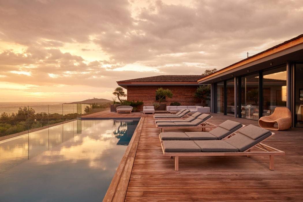 La piscine en surplomb de la baie est amarrée sur la terrasse en bois Kebony, un matériau qui lui assure, grâce à sa résistance, une durée de vie quasi éternelle et ce, sans aucun entretien.