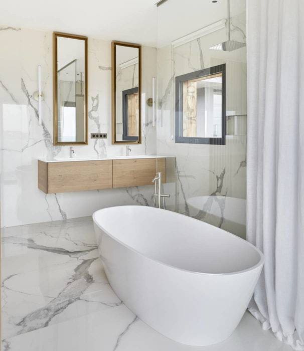 Eliminer le sable et le sel en s’immergeant dans cette vaste baignoire Casabath campée sur un sol en panneaux de grès cérame imitation marbre type « Statuario ». Puis admirer son bronzage dans les miroirs réalisés sur mesure par Reda Amalou Design. Appliques, Nedgis.