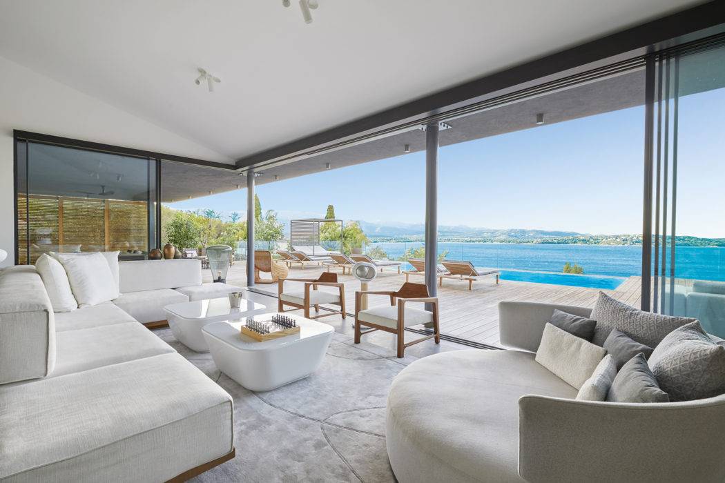 Pour jouir des effets spéciaux de la mer, on s’installe dans le canapé d’angle, création de Reda Amalou Design, à moins de se nicher dans le fauteuil rond « Amoenus » de Maxalto ou de s’allonger sur le tapis « Sèvres »de Hugues Chevalier, Reda Amalou Design. Tables basses Reda Amalou Design.