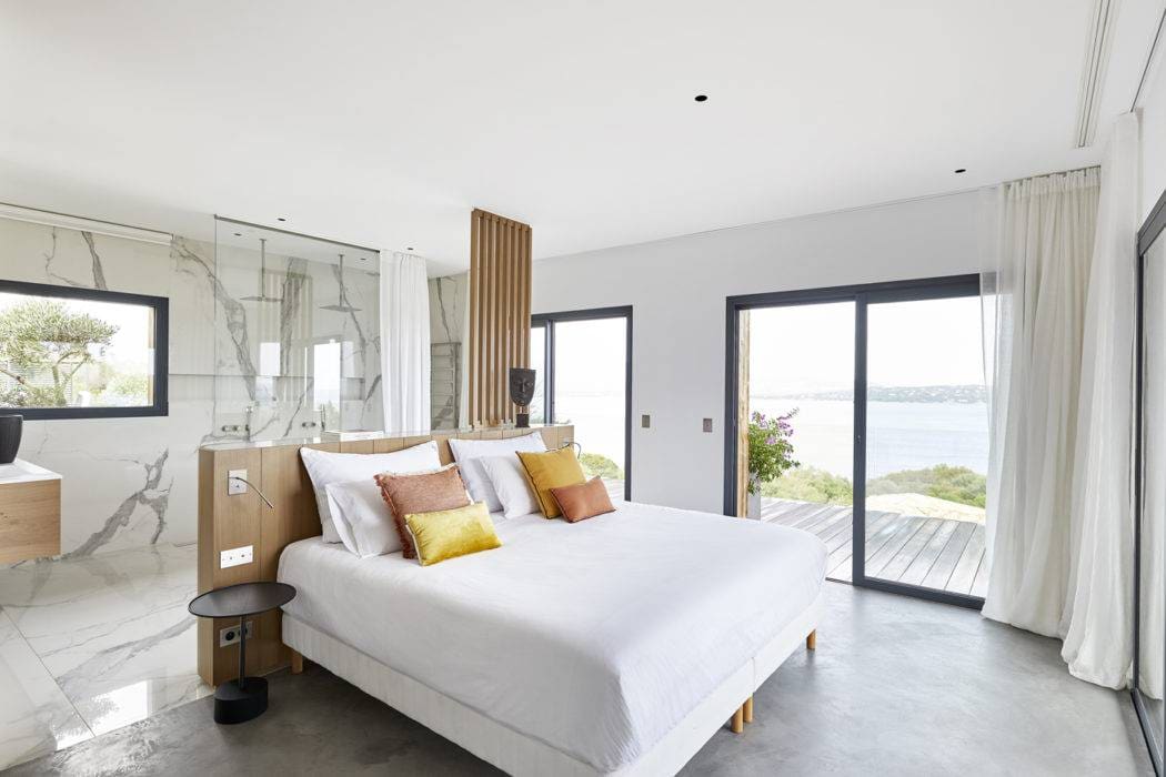 Dans la Master Bedroom style cabine de paquebot, dépouillée mais chic, avec pour déco l’horizon, quelques coussins AW2, un guéridon de Piero Lissoni pour Cassina et un masque africain chiné par Reda Amalou Design.