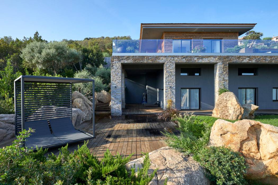 Tout en ouvrant la maison sur l’extérieur par un jeu de parois en verre coulissantes, ils s’appliquent à la rendre quasi invisible, la coiffant d’un toit en Red Cedar, bardant ses murs d’un appareil de bois et de pierres aux couleurs de la roche alentour. Puis, avec le paysagiste Fabrice Pierre Susini de Niwaki Jardins, après une étude du sol et de la flore, ils créent des « poches » de végétation, succession de jardins noyant la construction sans obstruer la vue, liant avec fluidité le bas et le haut du terrain, chose peu aisée compte tenu de la typologie de ces quelque 5 000 m2.