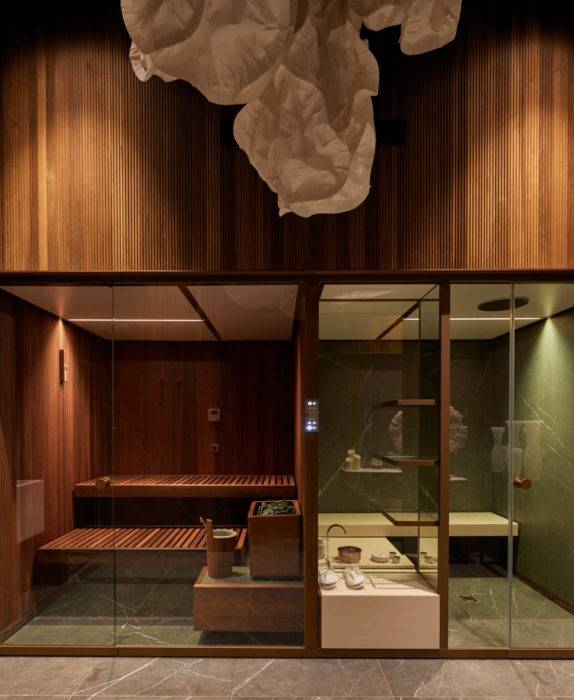 Massage, relax, forme… au spa, avant ou après la plage, on baigne dans une ambiance orientale créée par le grès cérame imitation marbre « Charming amber ». Vases chinés par Reda Amalou Design et suspension « Cloud » de Frank Gehry, Belux.