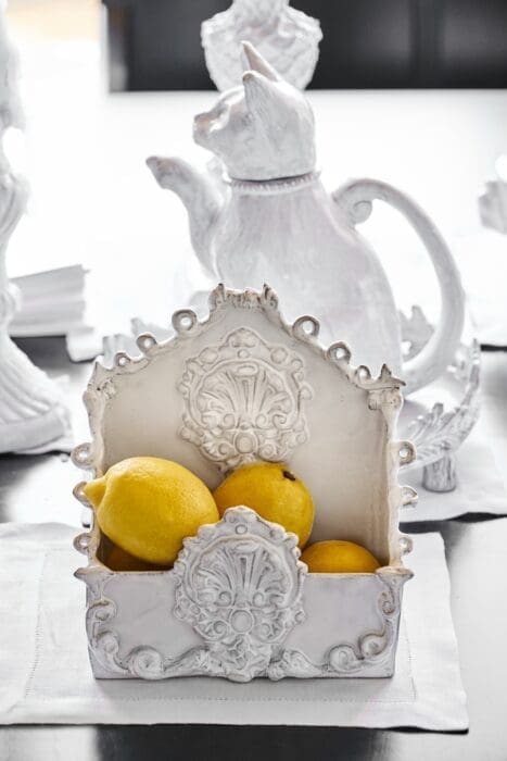 Des objets style vieille France en céramique blanche travaillée artisanalement pour une note nostalgique. Boîte à couverts « Neptune » détournée en accessoire déco, 460 € ; théière chat « Setsuko » en guise de cruche, 408 €, posée sur un plat rond à pieds « Setsuko », 419 €.