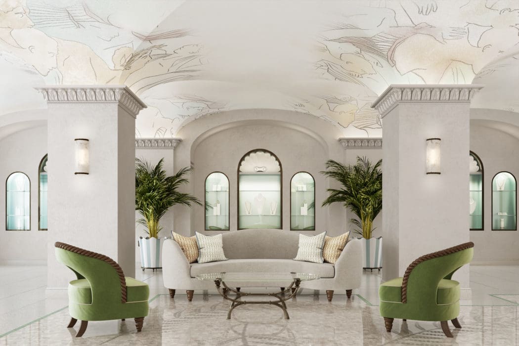 Été 2023 : l’ouverture de « son » premier hôtel, La Palma, Oetker Collection, à Capri. Ci-dessous, le hall et ses fresques au plafond.