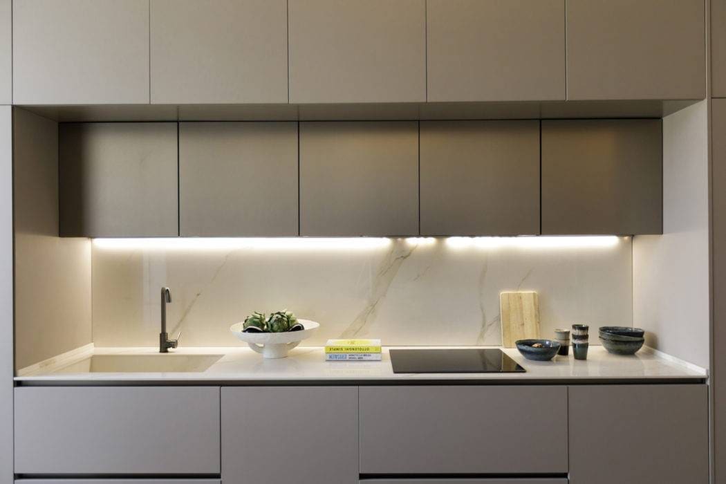 Conçue sur mesure, la cuisine se fond dans le décor. Le moindre centimètre carré a été optimisé, l’ensemble de l’électroménager dissimulé, les poignées volontairement oubliées. Sur le plan de travail Dekton® subtilement nervuré, coupe en papier mâché « Earth » by Marie Michielssen, Serax.