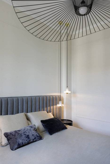 Apaisante, la chambre parentale se distingue grâce à ses belles lignes. La suspension « Vertigo » de Constance Guisset pour Petite Friture entame ainsi un joli dialogue avec la tête de lit conçue sur mesure en feutrine Kvadrat. Détail raffiné, deux suspensions « Stone » de Tom Dixon s’improvisent lampe de chevet et ajoutent encore du style à l’ensemble.