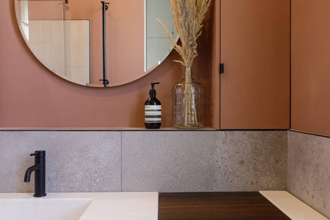 Déployée dans la salle de bains attenante à la chambre parentale, la teinte terracotta du « Rose ottoman » de Ressource associée à une herbe de la pampa peut friser le premier degré. Mais, en sublimant le graphisme des effets de matières, elle campe finalement avec brio une atmosphère méditerranéenne réactualisée. Cosmétique Aesop.