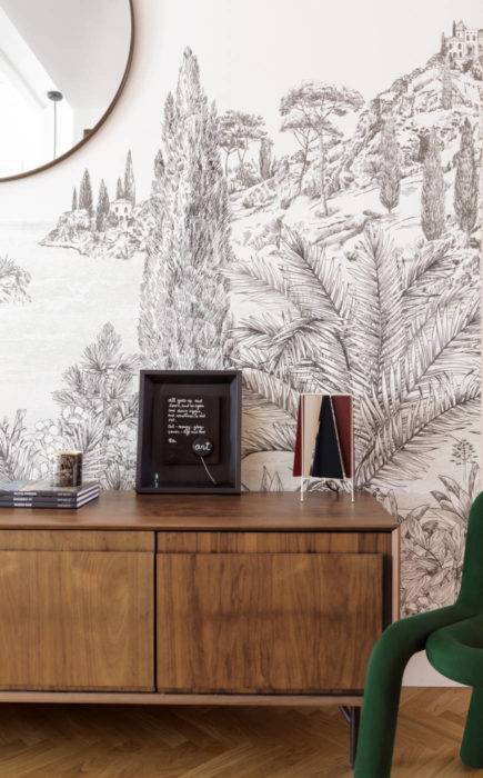 Le couloir qui dessert la pièce de vie débouche sur un jardin imaginaire… Délimitée par un papier peint Isidore Leroy, la transition entre salon et salle à manger se met en scène. Sur l’enfilade en noyer La Redoute Intérieurs, une œuvre de l’artiste Ben apporte la touche niçoise chère au cœur de l’agence Bleu Gris et voisine avec la lampe « B-4 » de Gubi.