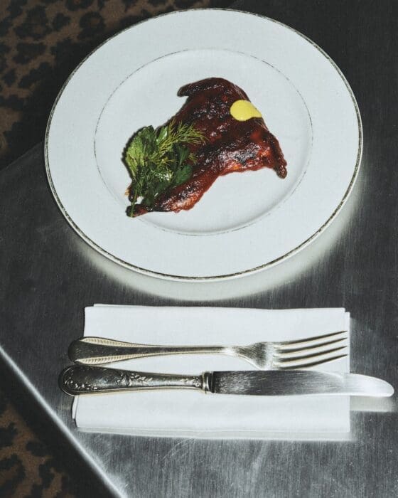 « Trois mots pour définir ma cuisine : spontanée, audacieuse, généreuse. On peut tout aussi bien croquer dans mon Panino Campobasso, débordant de truffes, inspiré du tramezzino milanais, en l’accompagnant d’un excellent verre de valtellina superiore, rouge de Lombardie, voire d’un Campari ou d’un negroni, affalé dans un canapé Rotondo de The Socialite Family, qu’apprécier, éclairé par des bougies, à la grande table d’hôtes, mon menu dégustation en sept services que je prépare devant les convives. Avec en une, deux plats signatures, la ventrèche de thon marinée au ponzu, relevée de caviar, et mon duck tonnato aux câpres frites, clin d’œil au veau tonnato. Chez Piccolo, on se fait plaisir. On s’amuse, on danse tard dans la nuit, pour vivre l’esprit vibrant et festif du Milan des années 1970. »