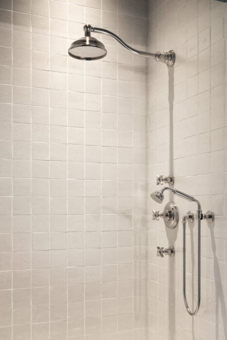 À gauche, l’ensemble complet de douche Héritage finition nickel brillant. À droite, le toilette néo-classique en céramique blanche et sa chasse d’eau suspendue, modèle 1900, en fonte d’aluminium.