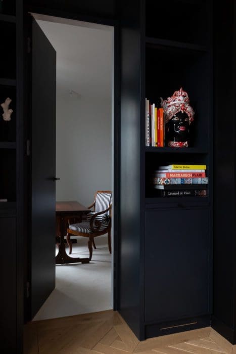 Troisième acte, en relation étroite avec madame qui va choisir les œuvres d’art : habiller le salon d’un mur noir pour accrocher les peintures, exposer les sculptures, poser les livres. Avec en son centre une cheminée, véritable pôle d’attraction tant lors des réceptions que les soirs où le couple se retrouve en tête-à-tête, en amoureux, pour lire, discuter, écouter de la musique ou juste contempler le spectacle des flammes.
