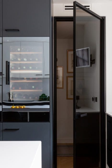 Premier acte : détruire l’imposante entrée, qui bloque littéralement la lumière et assombrit l’ensemble, au bénéfice d’un sas plus modeste avec des parois coulissantes en miroir et en verre, histoire de voir sans être vu. « Je voulais redonner une respiration, une envergure, explique Camille Hermand. Les parois coulissantes permettent de moduler les pièces, les ouvrant toutes lorsque le couple reçoit, recréant une intimité, un cocon élégant lorsqu’ils y séjournent seuls.»