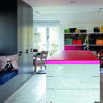 C’est un écrin très élégant où le luxe reste sobre et discret. Chaque dé – tail est pensé comme les limites des changements de sol, l’assemblage des matériaux, les portes coulissantes qui s’effacent dans le mur, les poignées de portes, les interrupteurs… On est dans une perfection qui n’admet pas l’imperfection. Tout est calé au millimètre près. Les bibliothèques, les dressings, la cuisine sont dessinés par Bruno Moinard et sont réalisés par la société Obumex, grand spécialiste des rangements sophistiqués en Belgique. La maison est agencée de façon à ce que les habitants puissent s’isoler en fermant les portes coulissantes ou choisir de vivre avec les autres. Il y a plusieurs coins habitables.