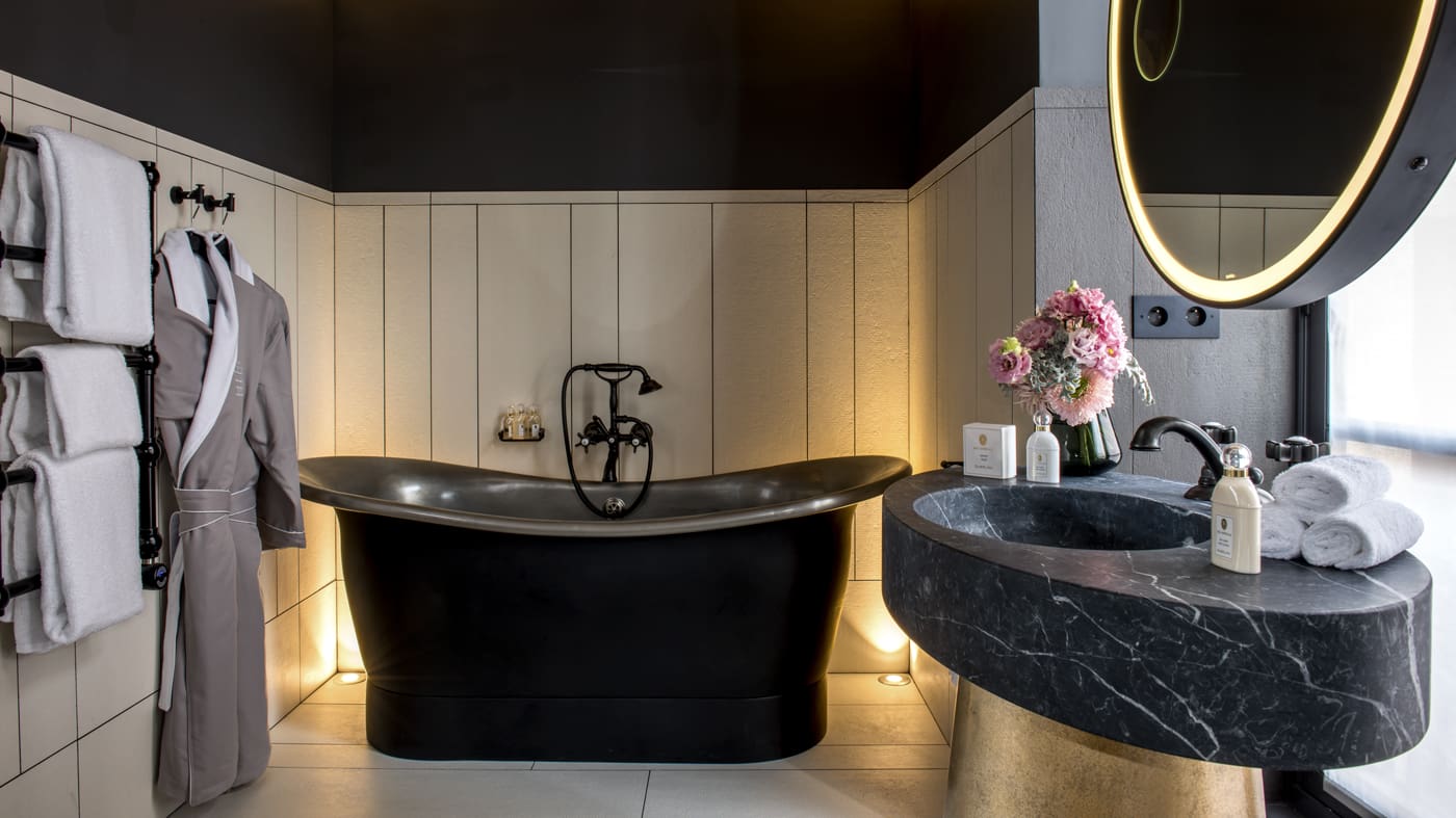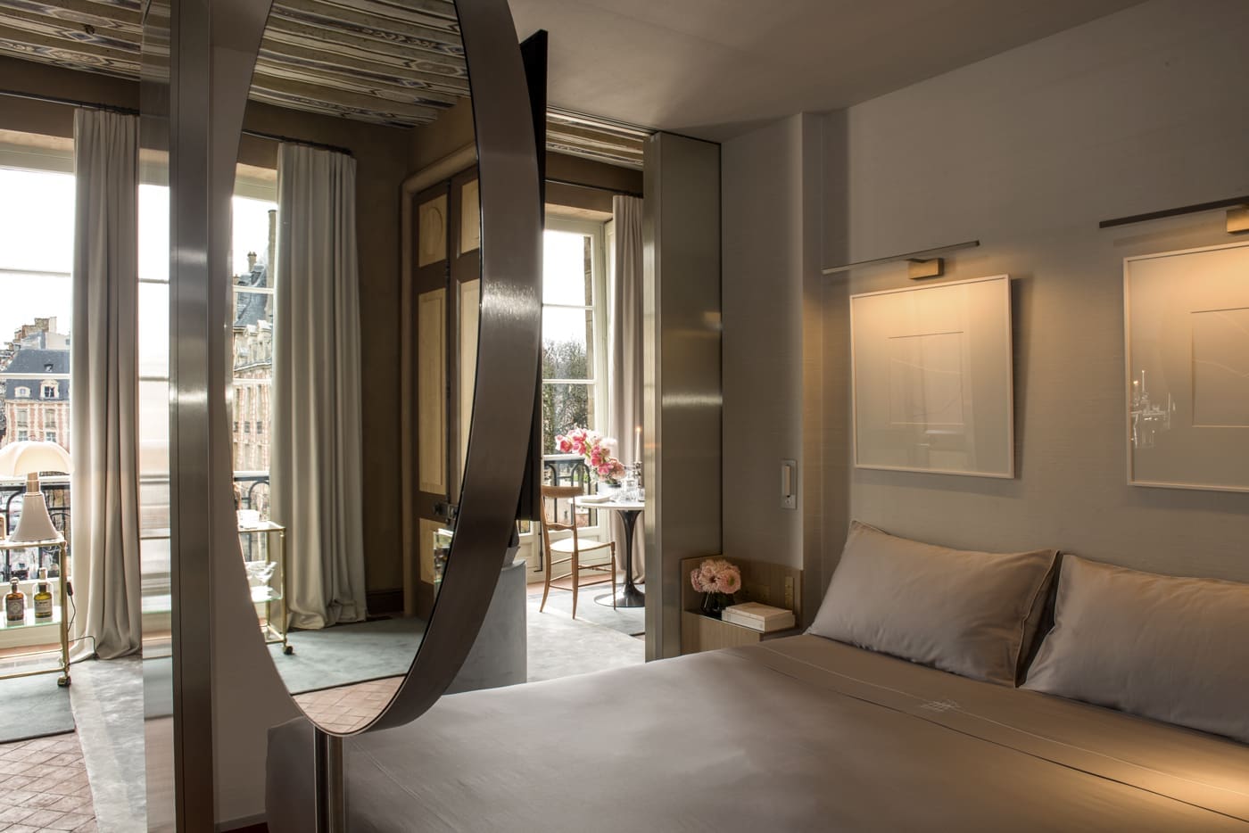 12 chambres et suites, à partir de 500 € et jusqu’à 3000 €. Nos préférées : la 303 avec baignoire donnant sur la place et la 401, mansardée, style studio.