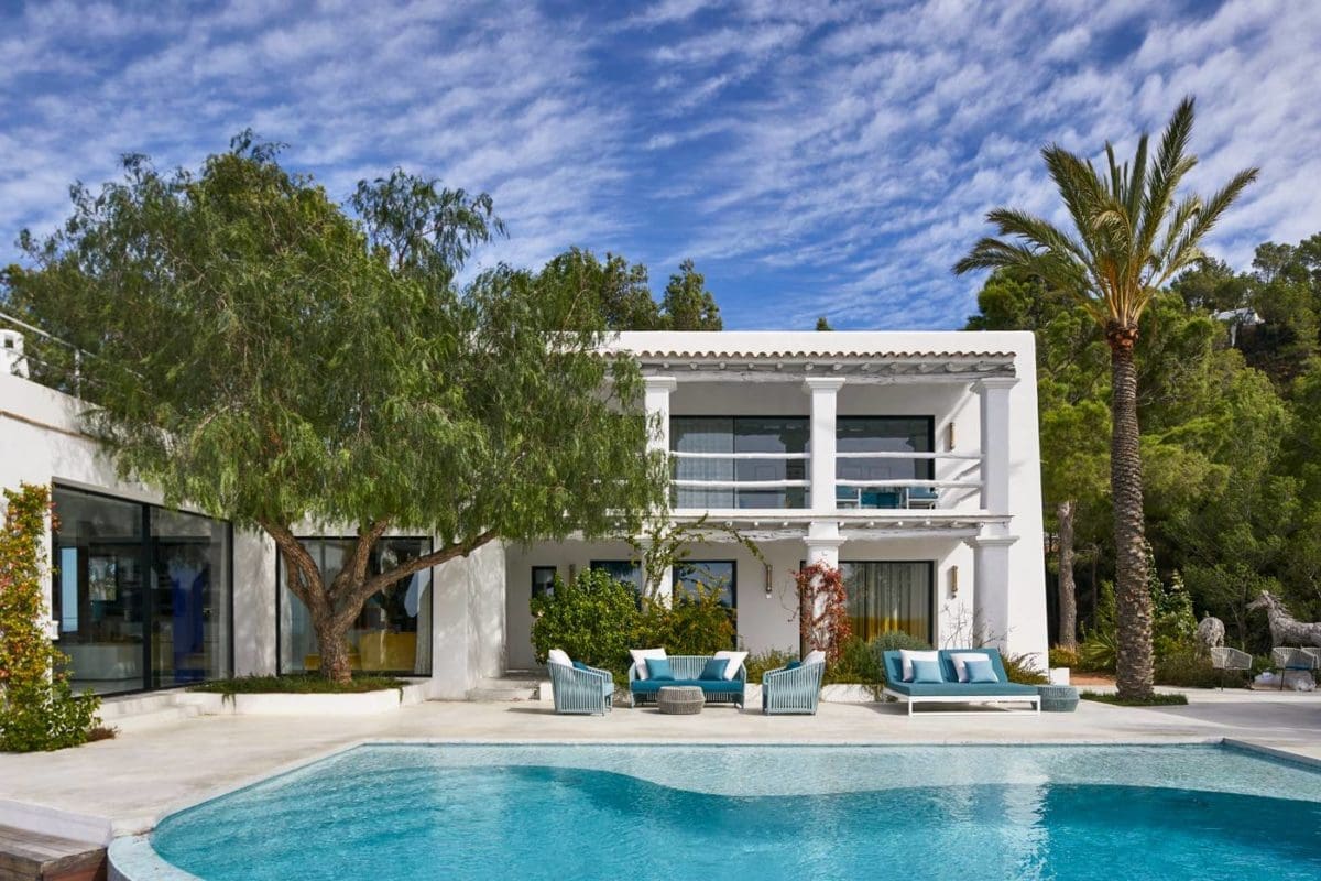 Cette villa perchée sur les hauteurs d’Ibiza, la capitale, au-dessus de la baie de Sant Antoni, face aux plus fabuleux couchers de soleil du monde, conte sous ses poutres rustiques d’origine et à l’ombre de ses très vieux arbres ces épisodes marquants. Finca à l’origine, ses occupants y élevaient des chèvres et des moutons, bêtes peu regardantes sur la qualité du pâturage.