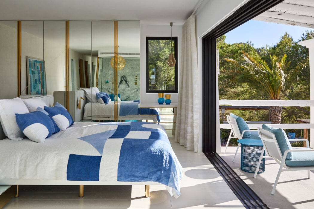 Dormir les baies ouvertes pour savourer le calme ou rêver sur sa terrasse meublée Kettal. Dans la chambre, dressing en miroir et feuille d’or de Solène Eloy de L’Atelier du Mur, voilage Nobilis, suspension Bomma. Tableau d’Aldo Kodac, galerie The Rose Ibiza.