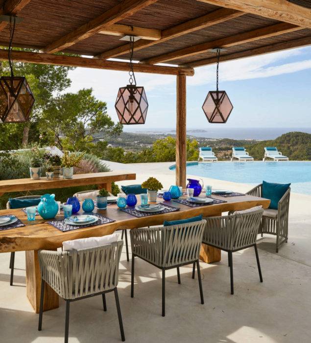 Déjeuner sous la pergola de Maison Numéro 20, face à la baie de Sant Antoni qu’une légère brise caresse souvent. Table en bois massif posée sur le sol en béton ciré. Lustres Contardi Italia.