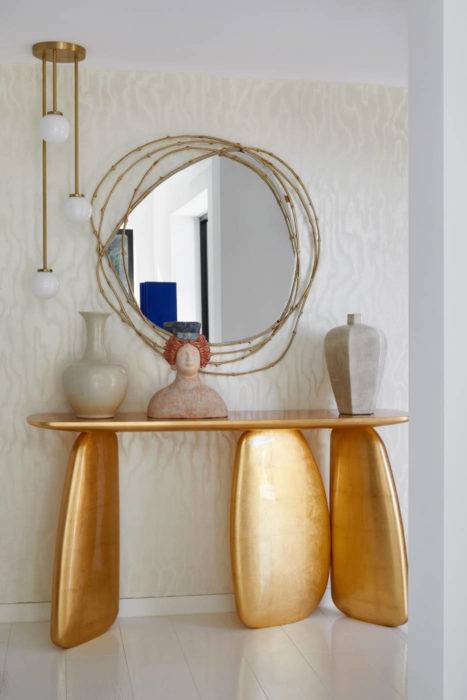Jouer la sophistication avec une console Brabbu décorée à la feuille d’or et des murs en moire Nobilis. Le lustre CTO Lighting éclaire le buste de Tanit, déesse de Carthage, et les poteries de Can Kinoto, artiste d’Ibiza. Miroir Vine de Ginger & Jagger.