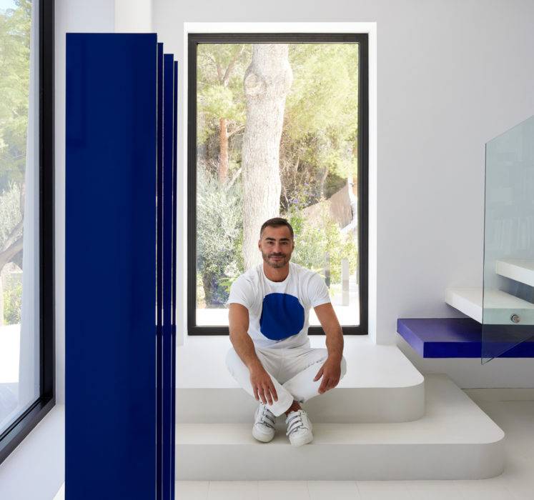 Oscar Lucien Ono, l’architecte décorateur, pose en tee-shirt bleu Klein en bas de l’escalier dessiné par son studio MaisonNuméro 20. La première marche bleue se prolonge en console face aux radiateurs Antrax bleu nuit.