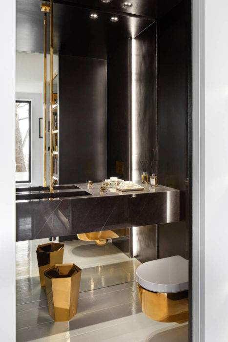 Lavabo d’invités, esprit boîte de nuit, en noir et or, avec son jeu de miroir pour agrandir l’espace. Vasque en pierre noire, Porcelanosa, robinetterie Dornbracht.