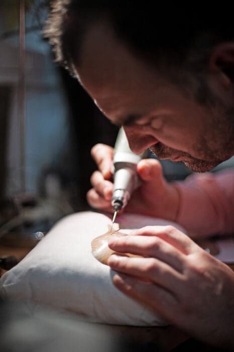 « Pour l’idée, ma sensibilité. Pour l’exécution, mes mains sont les instruments majeurs, assistés par des outils détournés des métiers d’art : fers, pinces de parurier, instruments de précision de joailliers. La liste est longue et se renouvelle constamment. »
