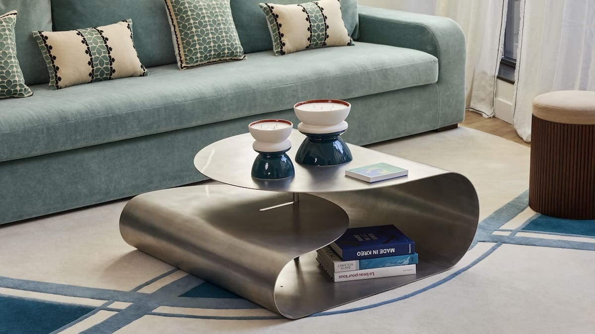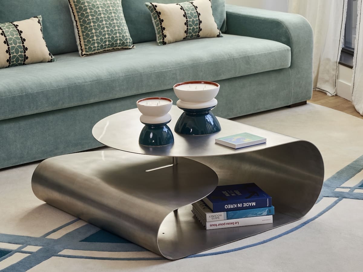 La table basse (ci-dessous) et la table d’appoint Gégé, façonnées d’une seule feuille d’inox brossé, sans soudure apparente, s’imposent comme de véritables sculptures dans le salon. Leurs volumes généreux et leurs courbes graphiques sont aussi chics que pratiques.
