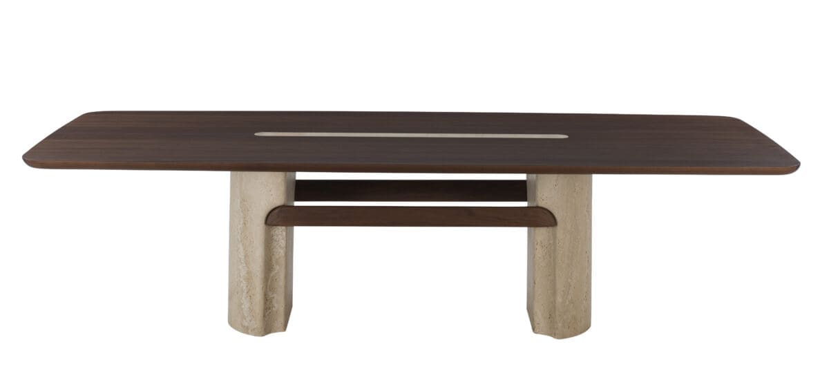 Célèbre pour son exploration de la matière et des formes sculpturales, Christophe Delcourt signe la collection « Palatine » pour Roche Bobois, s’inspirant de l’architecture italienne happant la lumière de la péninsule grâce à ses détails typiques comme les colonnes, les creux et les saillies. Cette fois, le créateur passe au crible deux matériaux emblématiques de l’éditeur hexagonal : la pierre et le bois. Le noyer, une essence luxueuse à la surface extra-lisse, rencontre le travertin, une roche très appréciée pour sa brutalité et ses imperfections naturelles. Ces deux matières que tout oppose forment un duo complice se concrétisant en un buffet et une table à manger, les pièces maîtresses de la collection. En complément, « Palatine » dévoile aussi deux assises aux courbes généreuses : un canapé et un fauteuil soulignant le travail du designer français autour du volume.