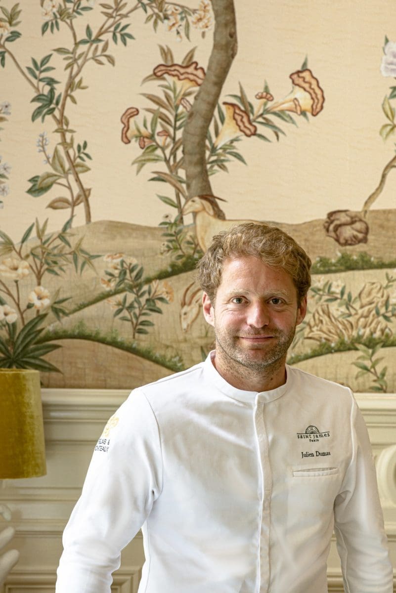 Aux commandes des cuisines, Julien Dumas, 43 ans, à l’écoute de ses convives comme de son équipe et de ses fournisseurs, est un chef sensible aux belles âmes et aux belles choses. « J’aime ce décor végétal, un rien japonisant comme mes plats inspirés du kaiseki ryôri (plusieurs petits plats gastronomiques japonais servis en même temps, NdlR), mariant avec élégance et raffinement de petites assiettes, façon tapas élaborées, confie-t-il. Pour moi, autant que sa carte, l’art de la table reflète la personnalité et le savoir recevoir d’un chef. » Le travail délicat de la jeune céramiste parisienne Laurette Broll le séduit : ses créations apportent une touche de poésie à ses recettes. Le jeune chef, attiré depuis toujours par les couteaux, apprécie l’approche très actuelle d’une nouvelle génération de créateurs de la Coutellerie Cognet, qui essaient de concilier esthétisme et développement durable. « Leurs manches en pots de yaourt récupérés prouvent leur volonté de ne plus utiliser seulement des matières nobles comme certains bois rares. » Il poursuit : « Entre chefs, on échange nos coups de cœur, nos découvertes. Ainsi, c’est l’un de mes aînés étoilés qui m’a conseillé le Fresh Express Eco-Respect Moulinex. » La cuisine et sa mise en scène ce sont souvent des histoires de rencontres, d’opportunités, d’échanges.