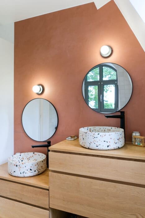 La collection Dekton® Kraftizen de Cosentino, spécialiste des surfaces architecturales, s’est imposée comme une évidence, avec son effet béton ciré semblant taloché à la main. Les propriétés uniques de ce matériau innovant, résistant et facile à entretenir, lui ont permis de se plier à différents usages, tout en apportant de l’harmonie et des nuances aux différents espaces. Dans la cuisine, l’architecte a choisi un beige lumineux pour le plan de travail, le sol et la crédence, en ton sur ton. Même principe dans la pièce d’eau de la suite parentale, avec un coloris sobre et moderne pour les murs, le meuble vasque et le sol, et également dans la salle de bains des enfants, rehaussée par un ocre plus ludique. « Très tendance, le béton ciré est souvent difficile à mettre en œuvre dans le cadre d’une rénovation, pour des questions techniques. Les grands formats Dekton® Kraftizen offrent une alternative bluffante, bien plus stable et durable dans le temps », explique la professionnelle, qui confie utiliser désormais les surfaces Cosentino dans presque chacun de ses projets. À suivre, donc !