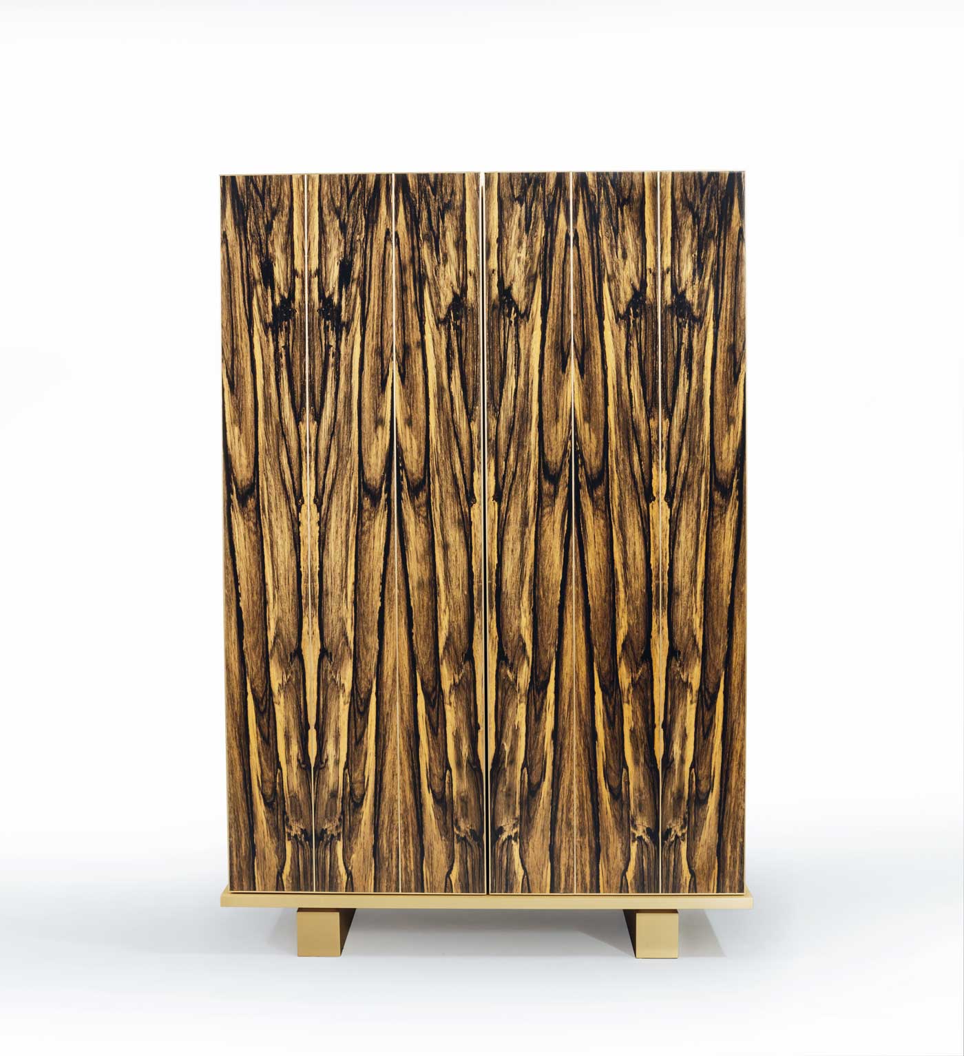 Le cabinet Plumage réalisé à partir d’ébène royale, bois rare et esthétique, est remarquable. Il semble avoir été travaillé tel un dessin à l’encre de chine, à la fois graphique et animal.